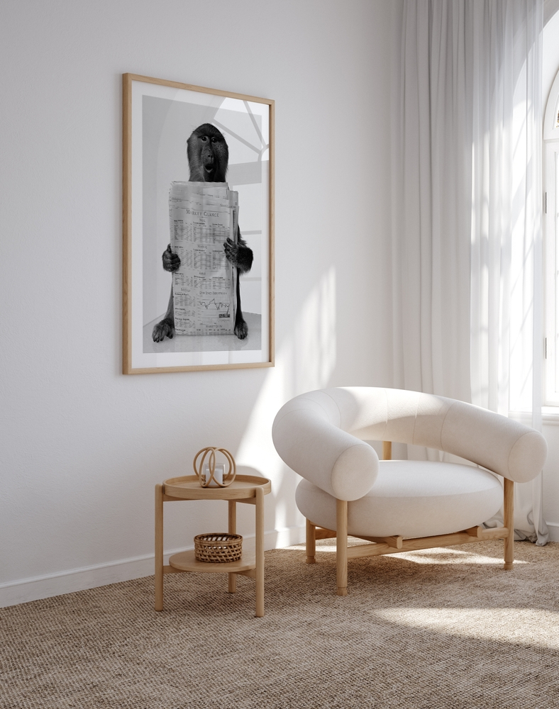 Svartvit fotokonst av en lätt arg och självsäker schimpans som läser en nyhetstidning.