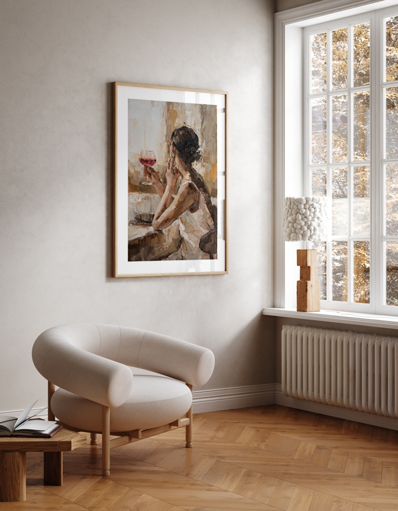 Handmålad tavla av en kvinna som sitter i sitt kök, dricker ett glas vin och kollar ut genom fönstret.