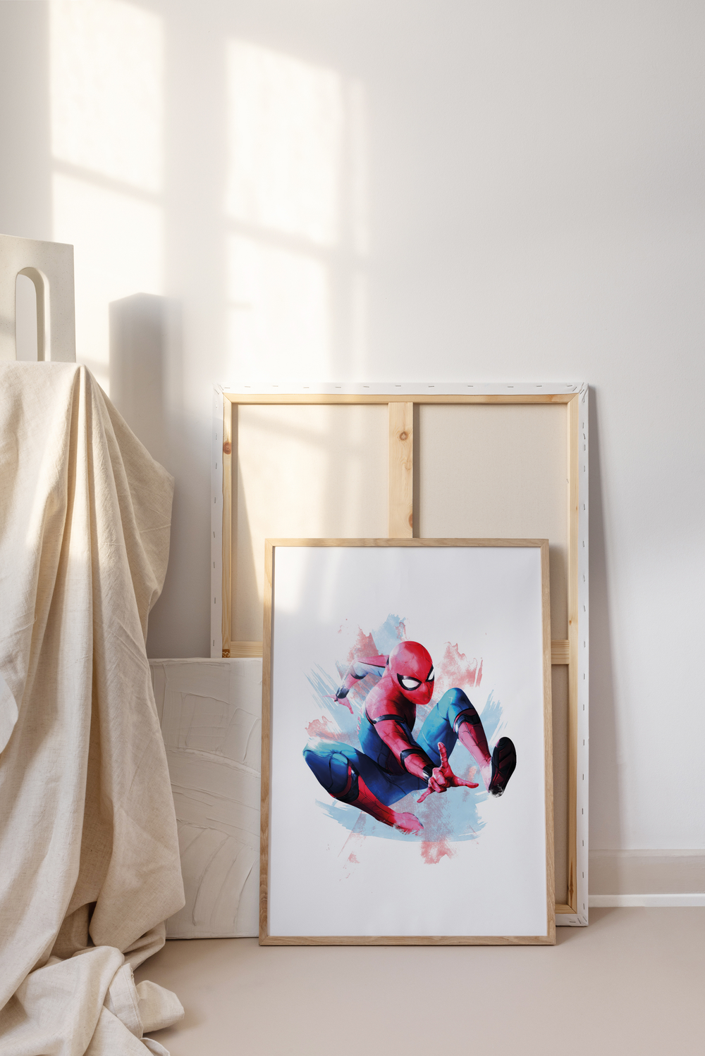 Poster som illustrerar superhjälten Spiderman i en målad känsla med målad effekt baktill i ljusblå och röd färg.