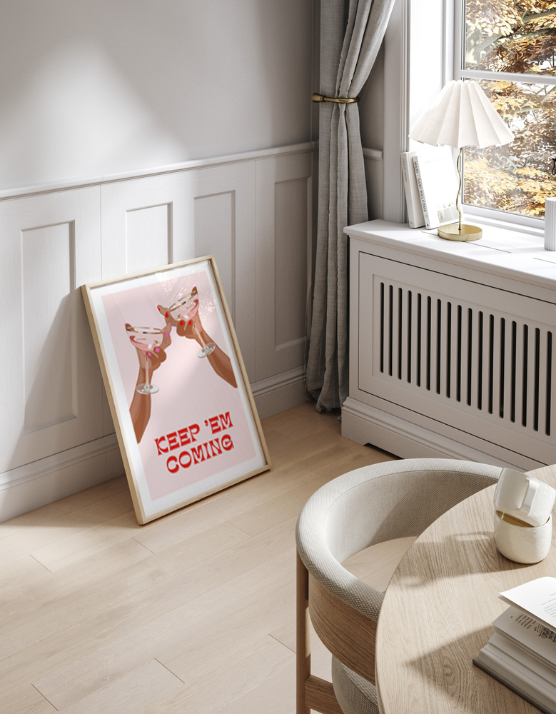 Grafisk illustration av två armar som håller i varsitt glas på en rosa bakgrund med vita kanter. Motiv nedtill med texten "Keep 'Em Coming".
