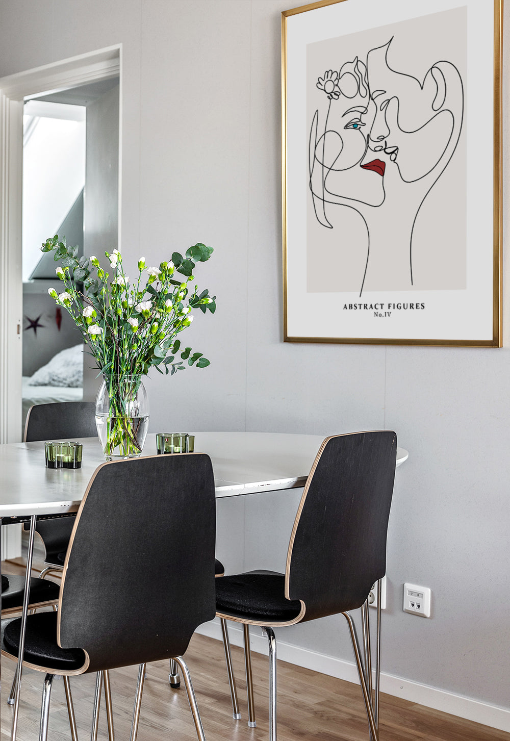 Poster skapad genom användandet av "continuous line art" för att skapa konst utan att lyfta pennan från pappret. Figurerna är ritade i svart med en beige bakgrund. Ansiktsfiguren till vänster har färgdetaljer i ögat samt läpparna.