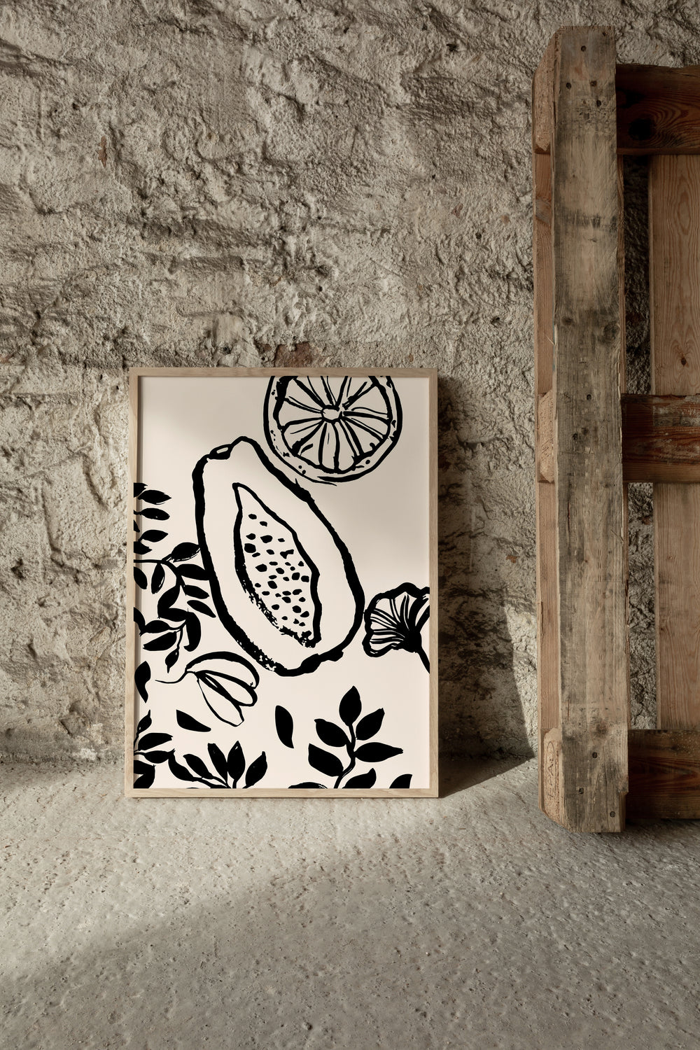 Poster som illustrerar frukter i en ritad känsla med svart färg på en beige bakgrund.