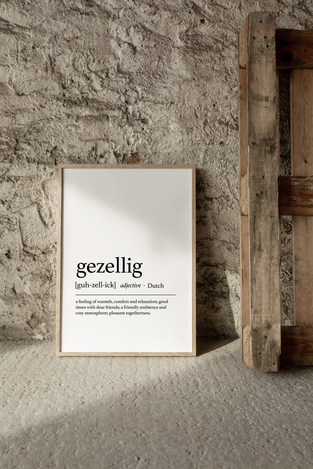 Poster med en beskrivande text om ordet "Gezellig" i svart textfärg på en vit bakgrund.