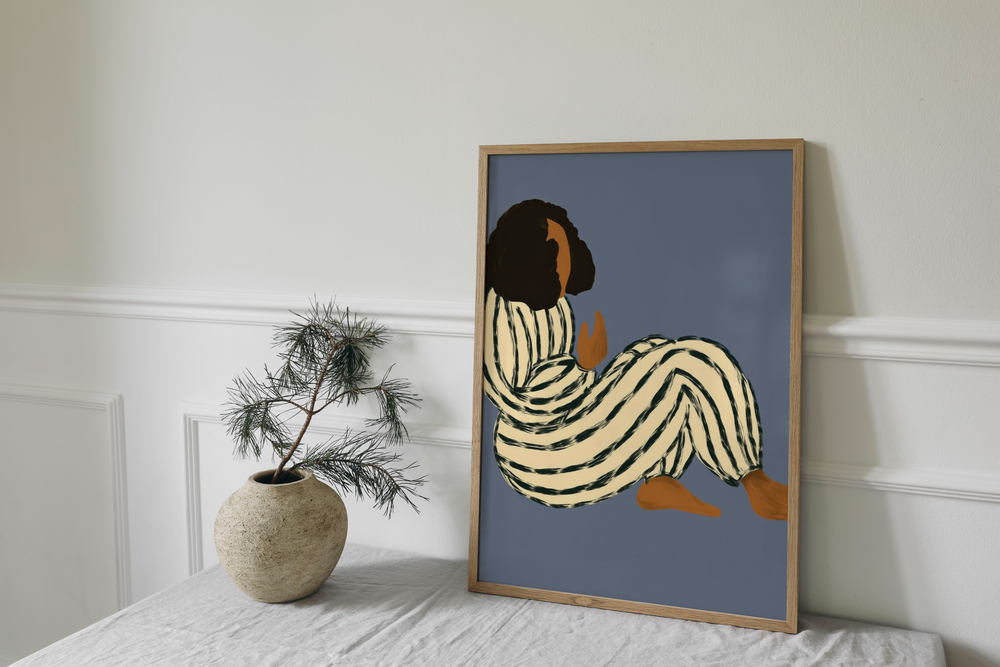 Poster som ursprungligen målats för hand och visar ett motiv av en kvinna i en randig gul och svart outfit som sitter på golvet med en sofistikerad blå-grå bakgrund.