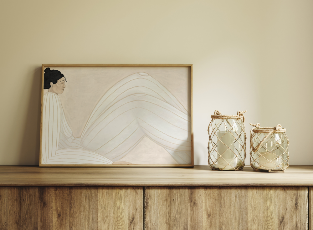 Poster som illustrerar en liggande kvinna i kombinerande beigea färger.